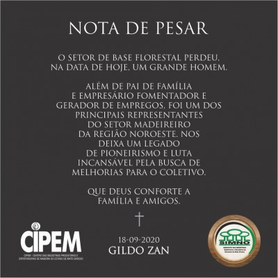 O Simno lamenta profundamente o falecimento do empresário do setor de base florestal Gildo Cezar Zan vítima de um acidente de trabalho na manhã de hoje.